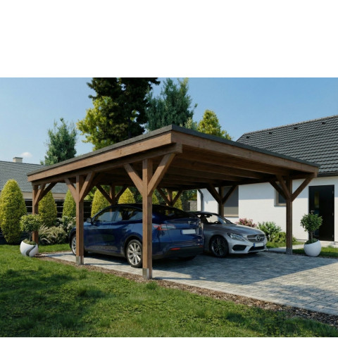 Wiata garażowa, drewniana z dachem jednospadowym zapewnia dużo miejsca dla czterech aut.