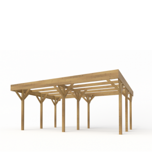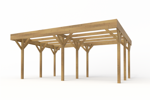 Wiata garażowa, drewniana z dachem płaskim na 9 słupach.