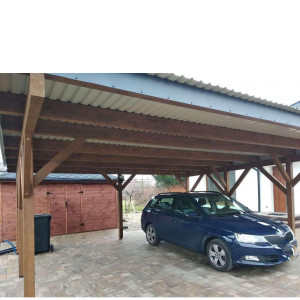 Wiata garażowa, drewniana z dachem jednospadowym zapewnia dużo miejsca dla dwóch aut.