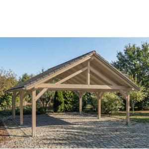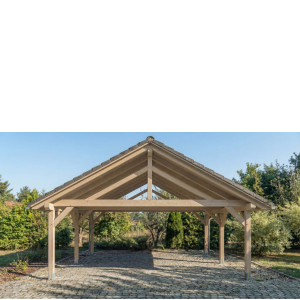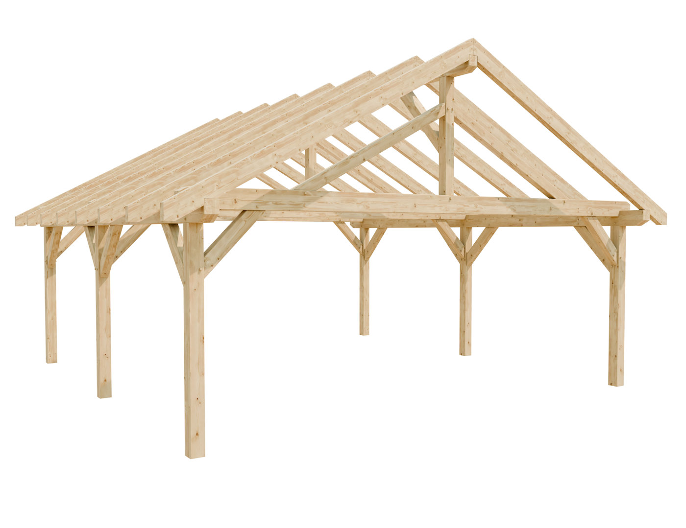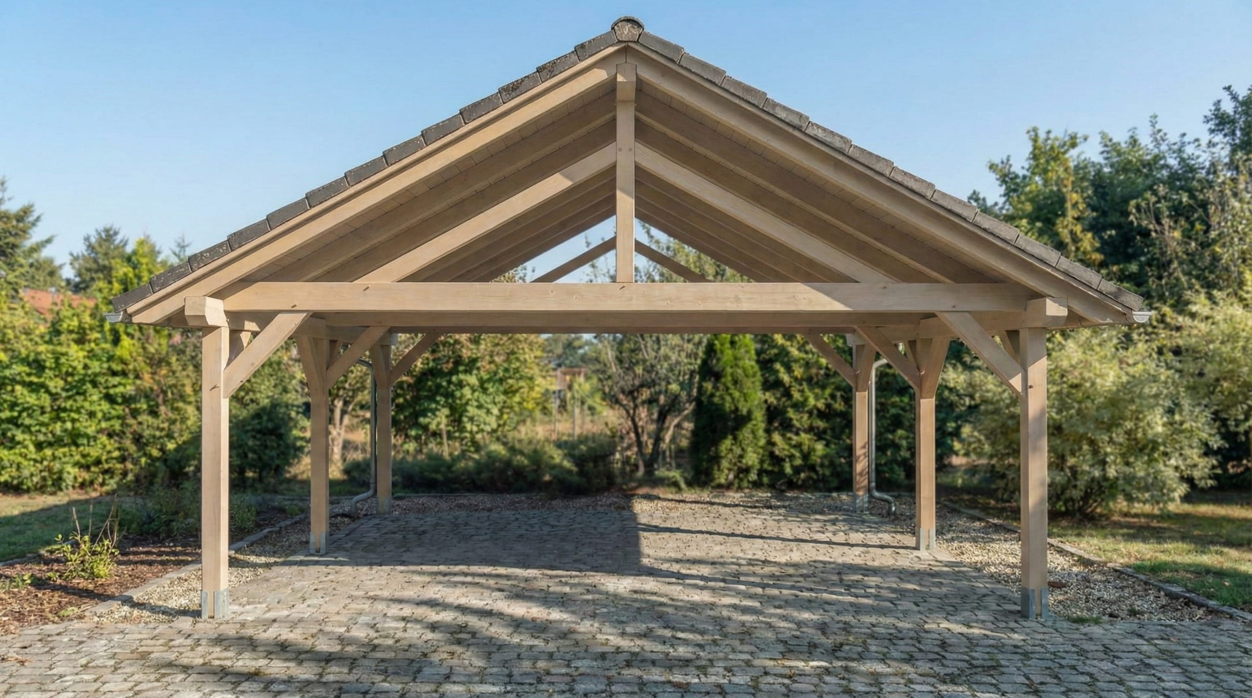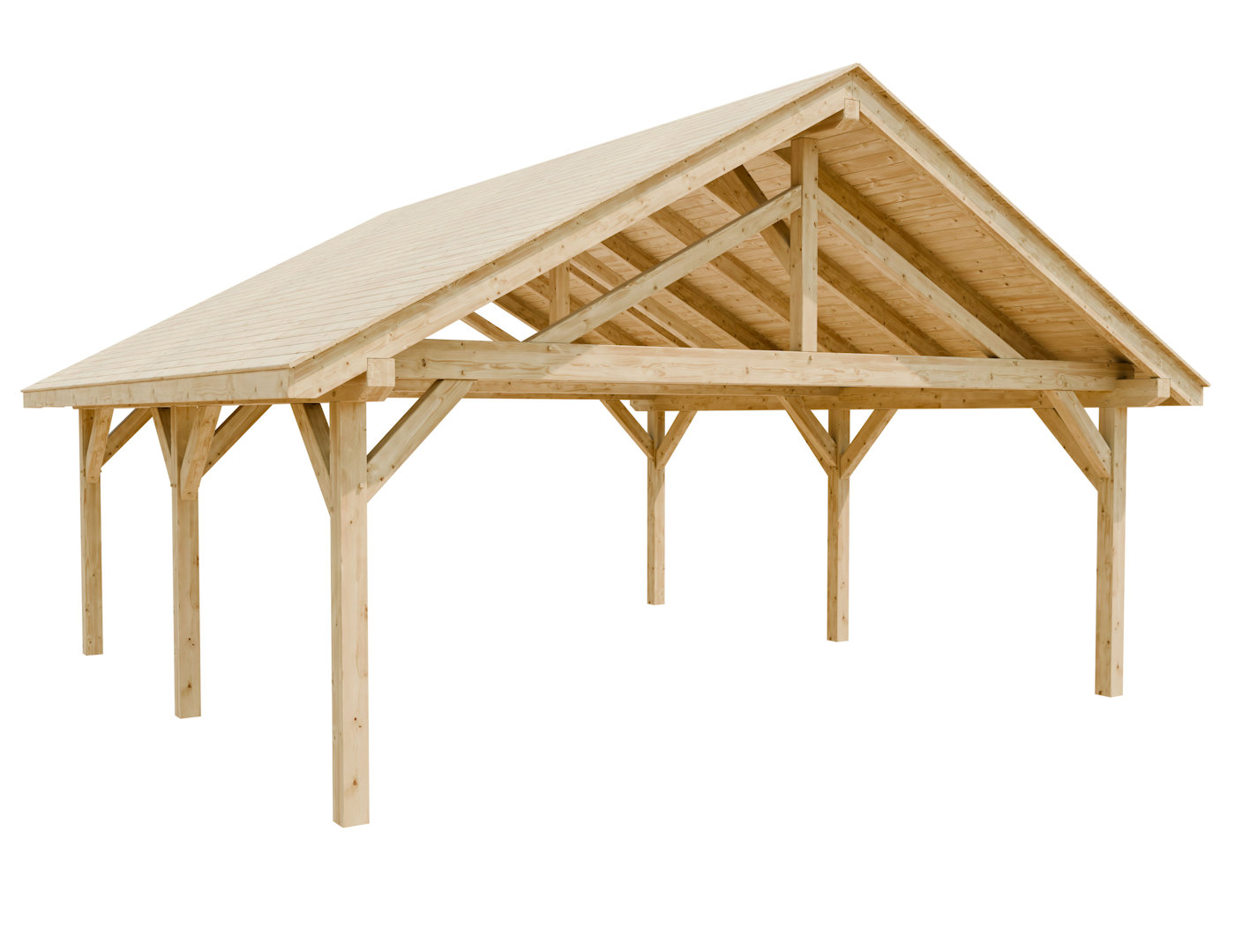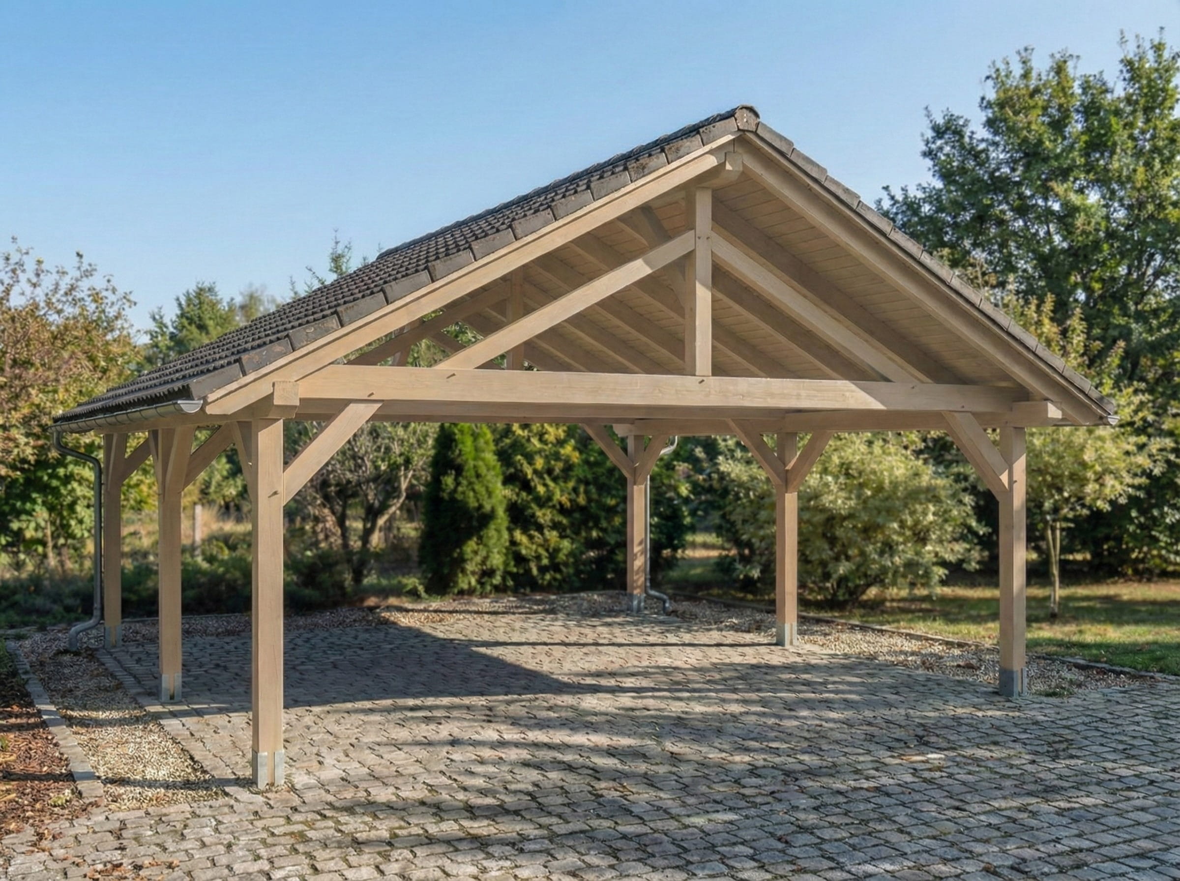 Drewniana Wiata garażowa z dachem dwuspadowym, zapewnia wystarczająco dużo miejsca dla dwóch aut.