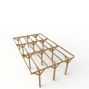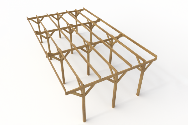 Wiata garażowa, drewniana z dachem płaskim na 12 słupach.