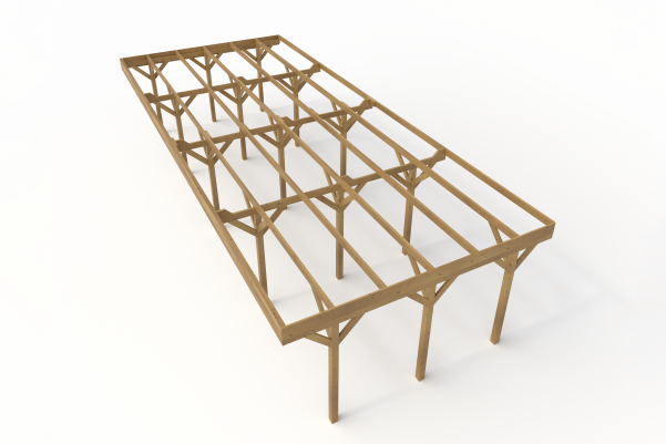 Wiata garażowa, drewniana z dachem płaskim na 15 słupach.
