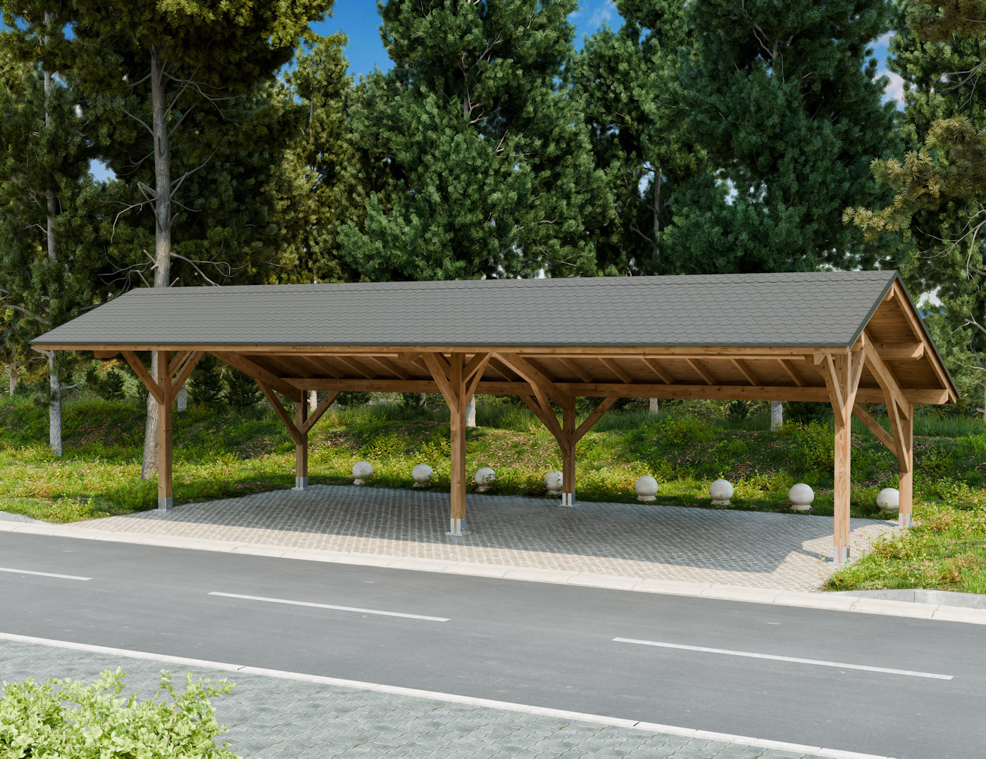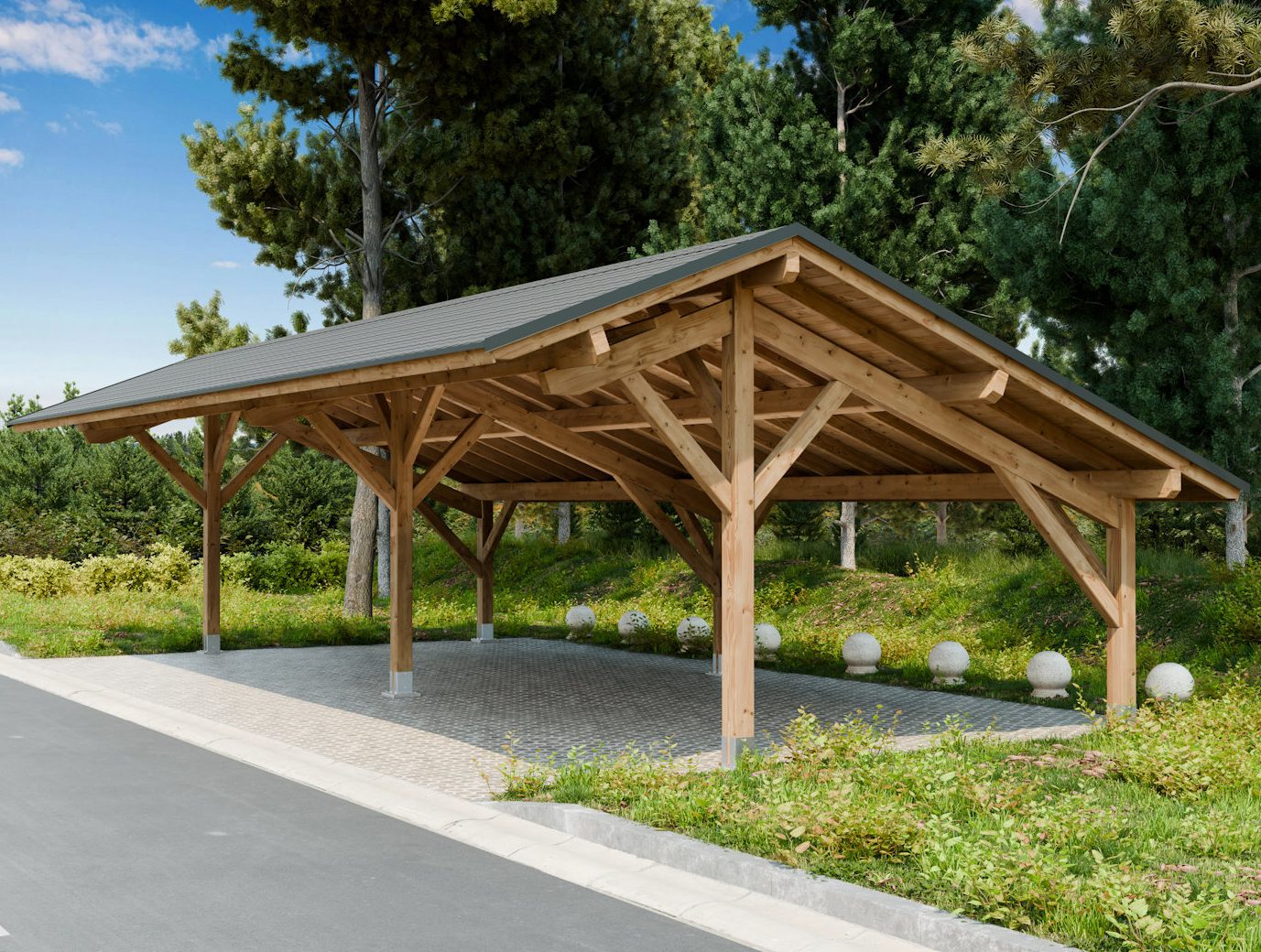 Wiata drewniana asymetryczna na cztery auta.