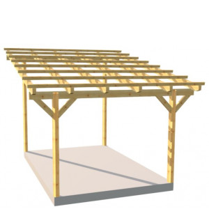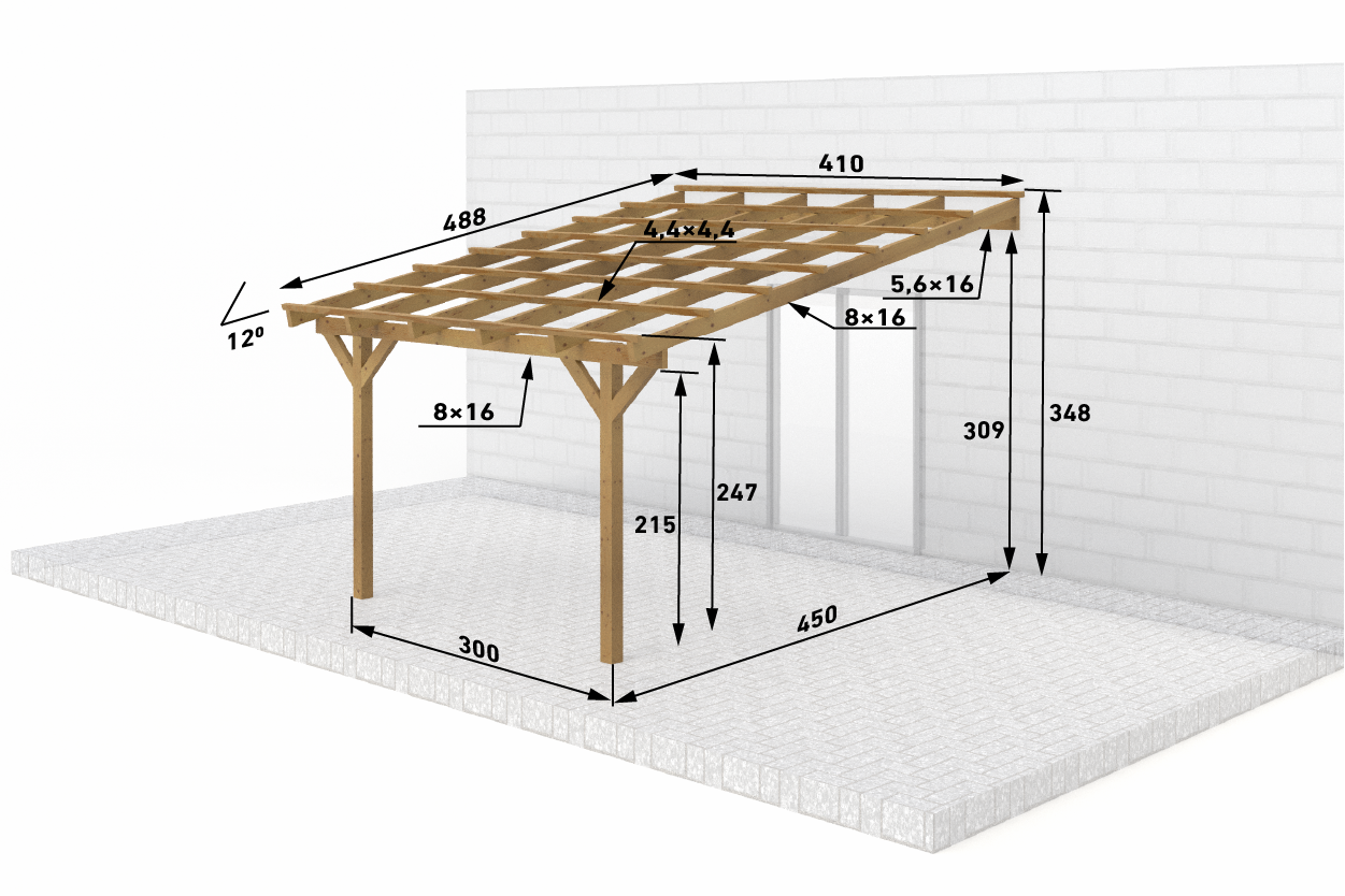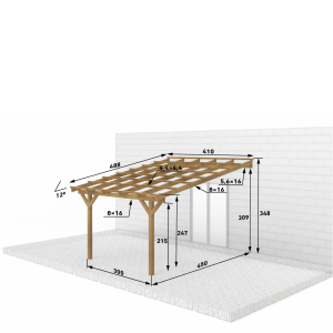 Zadaszenia tarasu z dachem 1 spadowym, prostym o szerokości 450 cm – rozstaw słupów, w długościach standardowych od 300 do 800 cm.