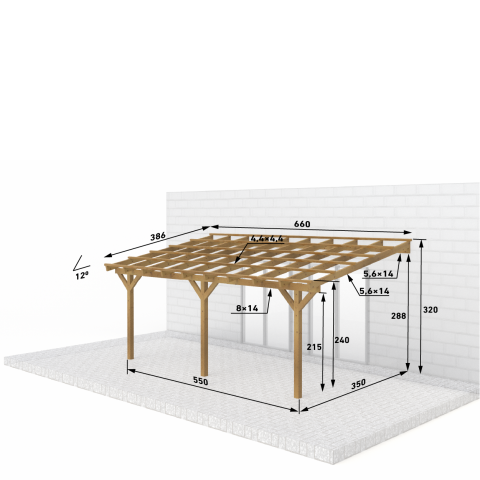 Zadaszenia tarasu z dachem 1 spadowym, prostym o szerokości 450 cm – rozstaw słupów, w długościach standardowych od 300 do 800 cm.