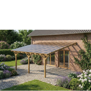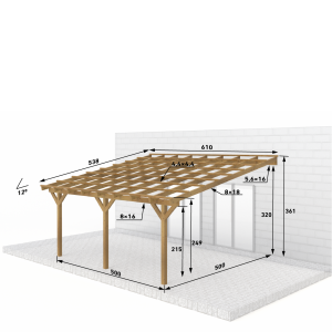 Zadaszenia tarasu z dachem 1 spadowym, prostym o szerokości 500 cm – rozstaw słupów, w długościach standardowych od 300 do 800 cm.