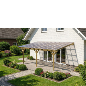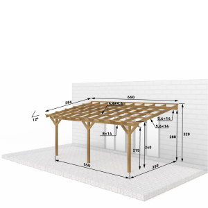Zadaszenie tarasu z dachem 1 spadowym, prostym o szerokości 350 cm – rozstaw słupów, w długościach standardowych od 300 do 800 cm.