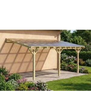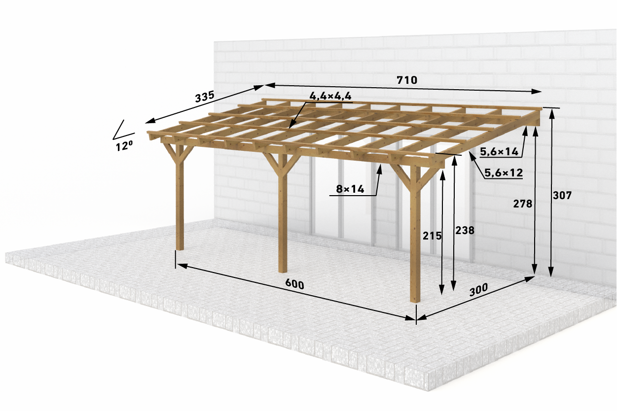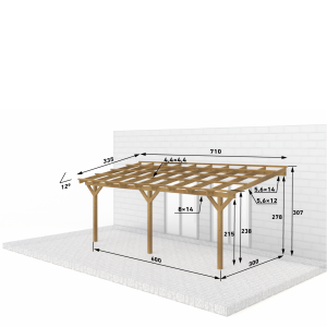 Zadaszenie tarasu z dachem 1 spadowym, prostym o szerokości 300 cm – rozstaw słupów, w długościach standardowych od 300 do 800 cm.