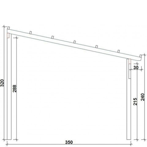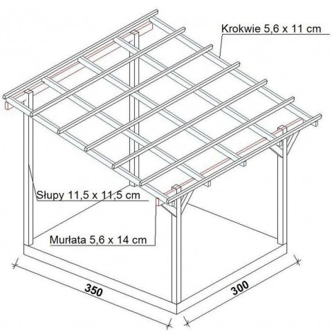 Zadaszenie tarasu z dachem 1 spadowym, prostym o szerokości 350 cm – rozstaw słupów, w długościach standardowych od 300 do 800 cm.