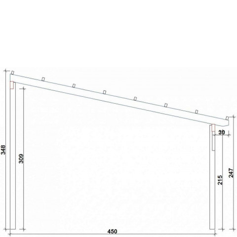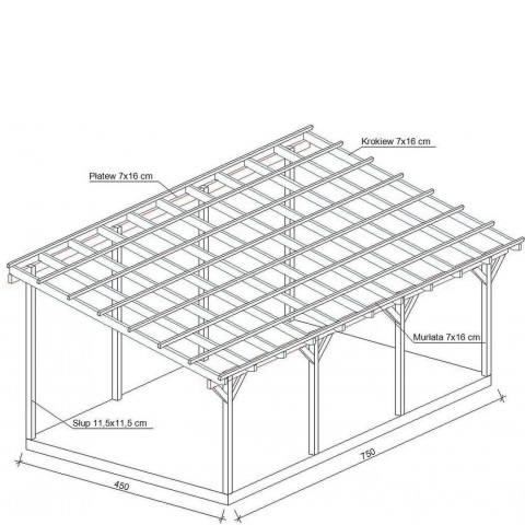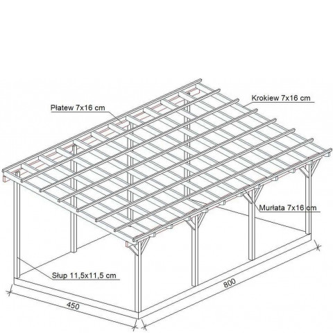 Zadaszenia tarasu z dachem 1 spadowym, prostym o szerokości 450 cm – rozstaw słupów, w długościach standardowych od 300 do 800 cm.