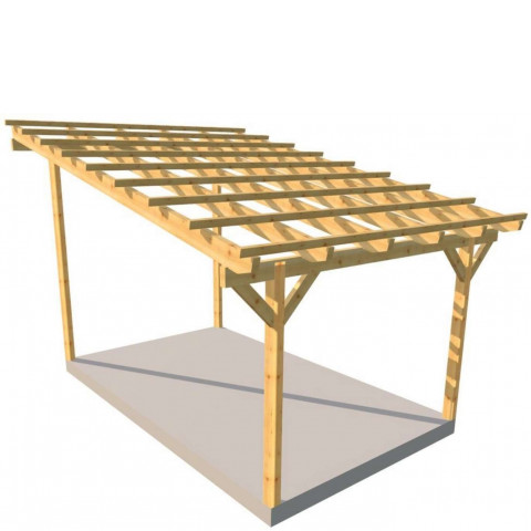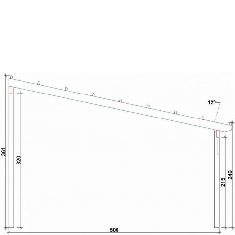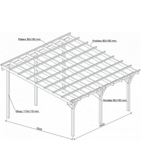 Zadaszenia tarasu z dachem 1 spadowym, prostym o szerokości 500 cm – rozstaw słupów, w długościach standardowych od 300 do 800 cm.