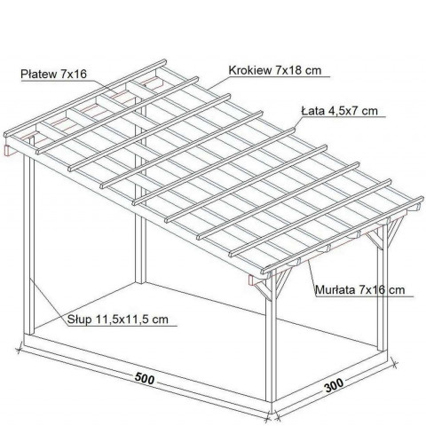 Konstrukcja nie zawiera pokrycia dachowego i elementów kotwiących do ściany i posadzki.