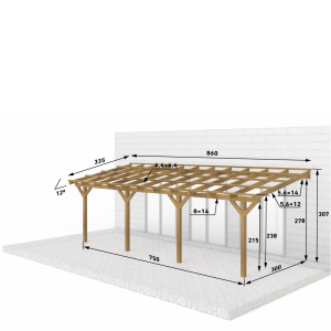 Zadaszenie tarasu z dachem 1 spadowym, prostym o szerokości 300 cm – rozstaw słupów, w długościach standardowych od 300 do 800 cm.