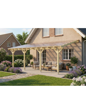 Zadaszenia tarasu z dachem 1 spadowym, prostym o szerokości 450 cm – rozstaw słupów, w długościach standardowych od 300 do 800 cm.