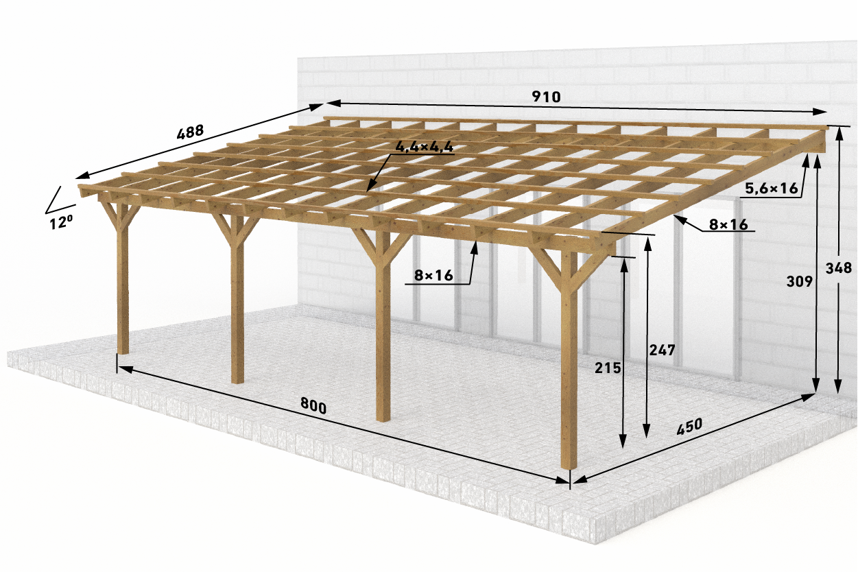 Zadaszenia tarasu z dachem 1 spadowym, prostym o szerokości 450 cm – rozstaw słupów, w długościach standardowych od 300 do 800 cm.