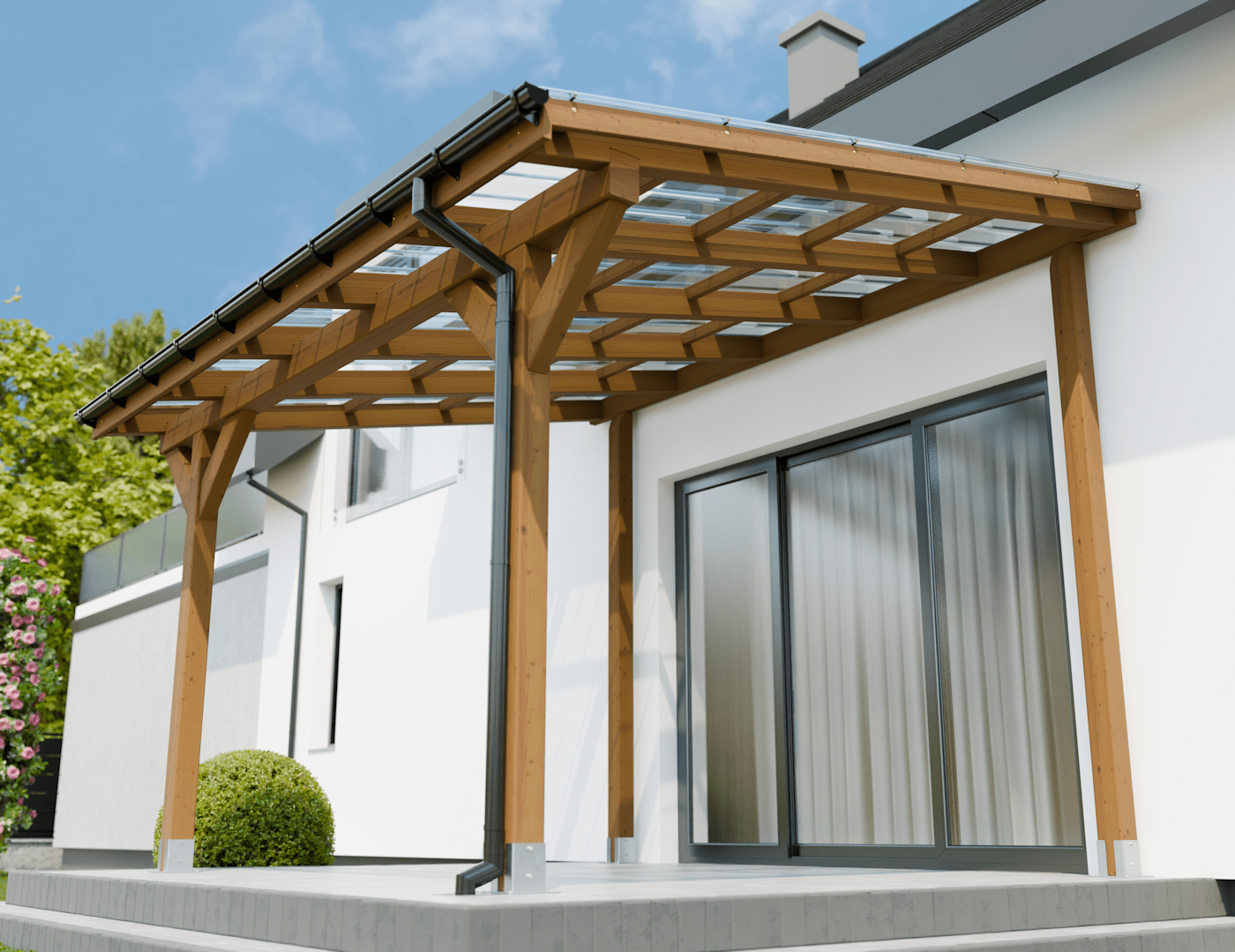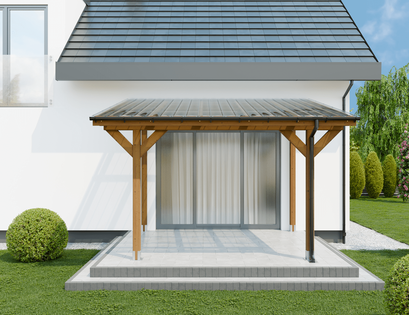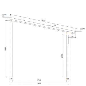 Zadaszenia tarasu z dachem 1 spadowym, prostym o rozstawie słupów: długość 300 x szerokość 300 cm.